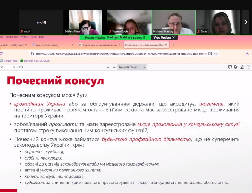 31.03.2026 року у межах навчальної дисципліни «Системи нотаріату та нотаріальний процес» для студентів спеціальність «Міжнародне право» (4 курс, денна форма навчання) була проведена бінарна лекція на тему «Роль почесного консула у виконання нотаріальної та інших функцій» та круглий стіл на тему «Правові системи нотаріату: цінний досвід для України».