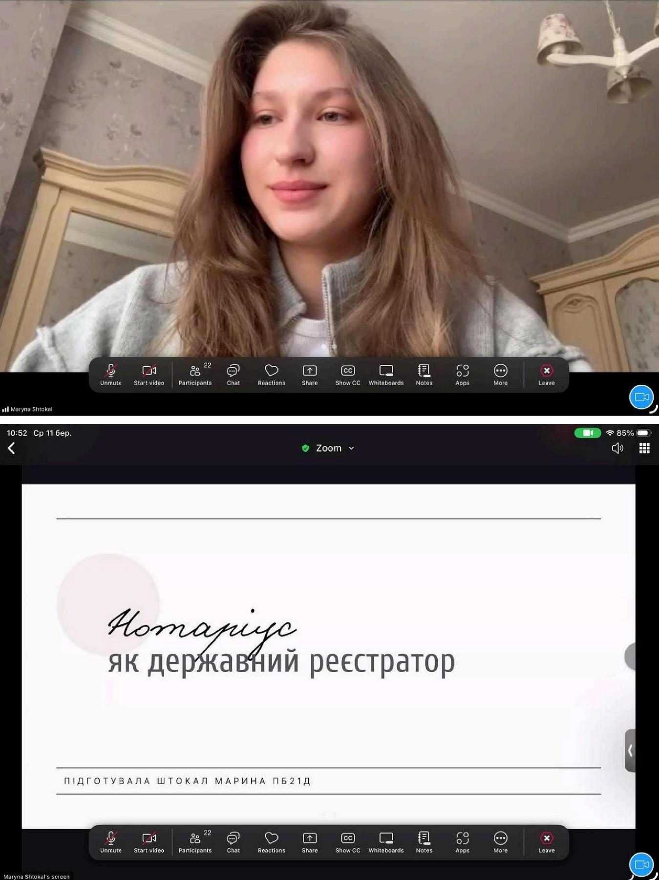 1. Лаухіна Анастасія: «Державна нотаріальна функція та її складові, співвідношення із функцією суду». У виступі було розкрито сутність нотаріальної функції, її значення у системі правового регулювання та роль нотаріуса у забезпеченні охорони безспірних прав та інтересів фізичних та юридичних осіб та держави. .
