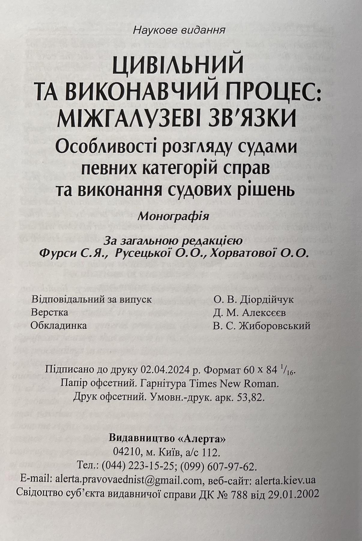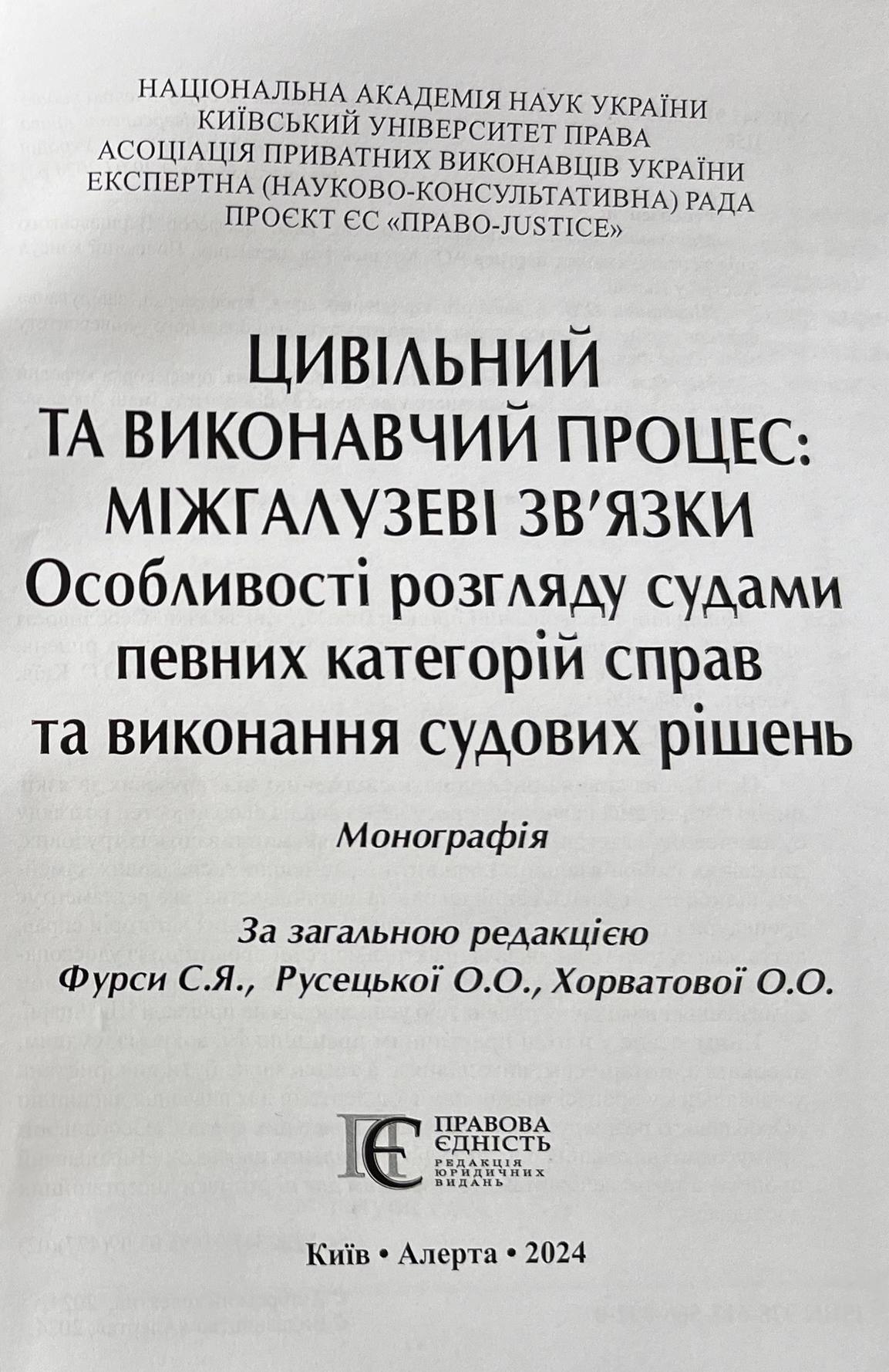 Щойно побачила світ колективна монографія  «Цивільний та виконавчий процес: міжгалузеві зв’язки. Особливості розгляду судами певних категорій справ та виконання судових рішень» за загальною редакцією доктора юридичних наук, професора, в.о. завідувача кафедри міжнародного права та галузевих правових дисциплін Київського університету права НАН України Світлани Фурси, кандидата юридичних наук, доцента, доцента кафедри міжнародного права та галузевих правових дисциплін Київського університету права НАН Оксани Хорватової та Голови Ради Асоціації приватних виконавців України Оксани Русецької. Наукову працю видано за сприянням Національної академії наук України, Київського університету права НАН України, Асоціації приватних виконавців України, Експертної (науково-консультативної) ради та Проєкту ЄС «Право-JUSTICE».